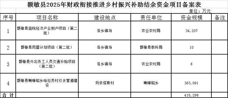 额敏县2025年财政衔接推进乡村振兴补助结余资金415.298万元,现将有关资金安排使用情况公示如下: