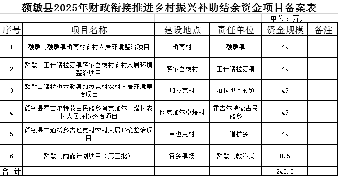 额敏县2025年财政衔接推进乡村振兴补助结余资金245.5万元,现将有关资金安排使用情况公示如下:
