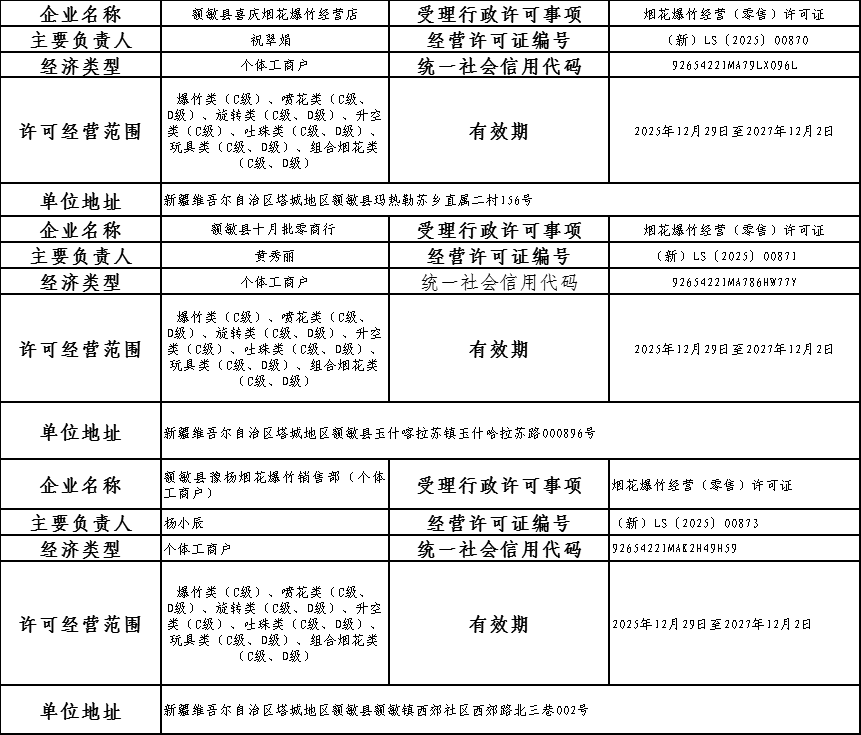 额敏县应急管理局行政许可信息公示(第四期)