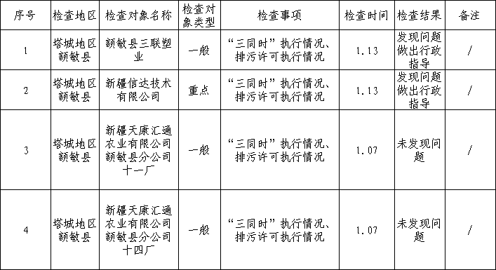 表1:2026年1月塔城地区生态环境局额敏县分局生态环境执法“双随机、一公开”抽查结果信息公开表