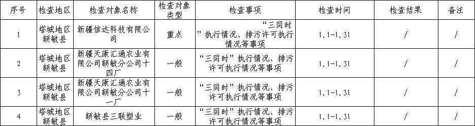 2026年1月1日至1月31日,塔城地区生态环境局额敏县分局组织开展生态环境执法“双随机、一公开”监管工作,现将具体信息公开如下: