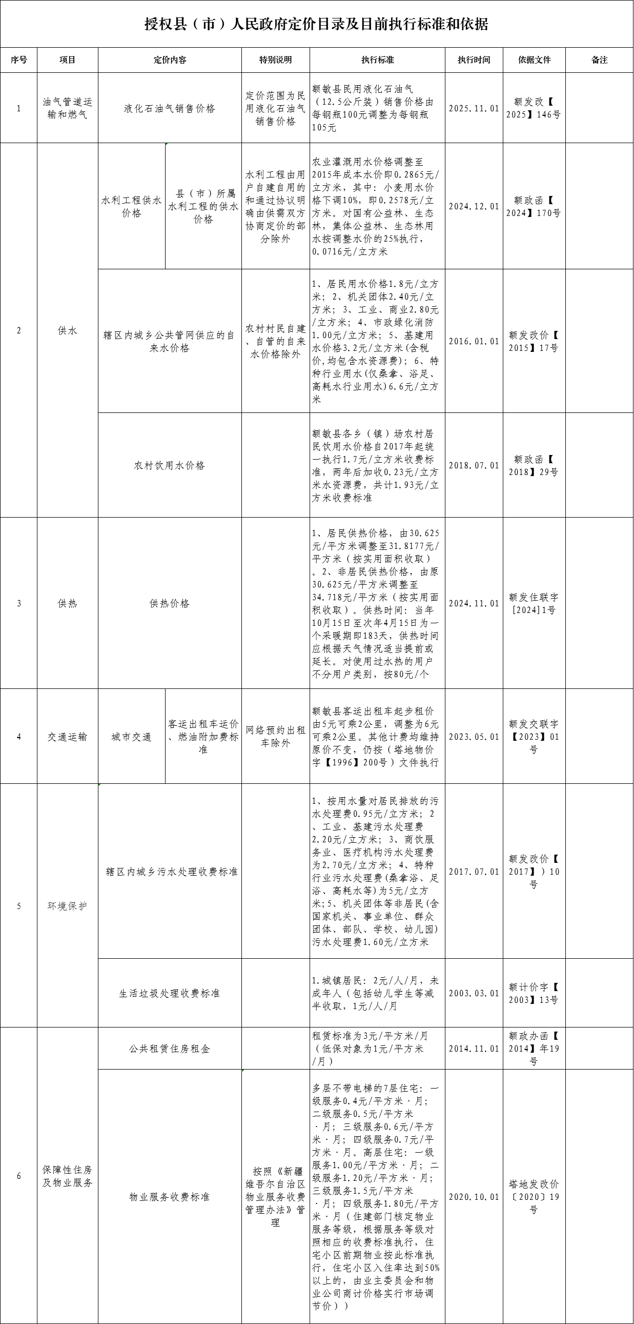 授权县(市)人民政府定价目录及目前执行标准和依据
