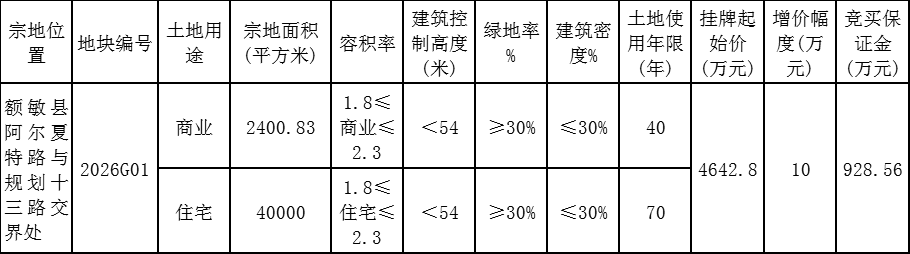 根据《中华人民共和国土地管理法》《中华人民共和国城镇国有土地使用权出让和转让暂行条例》、国土资源部第39号令《招标拍卖挂牌出让国有建设用地使用权规定》等有关法律法规的规定,经额敏县人民政府批准,批准文号为额政函〔2026〕18号,额敏县自然资源局拟定对额敏县阿尔夏特路与规划十三路交界处[2026G01]国有建设用地使用权公开挂牌出让。现就有关事项公告如下:
