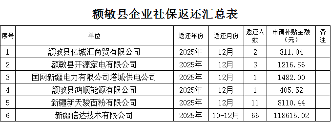 根据关于印发《新疆维吾尔自治区社会保险补贴办法》的文件要求,经企业初审上报、人社部门复审,现对额敏县6家企业申请享受社会保险补贴情况进行公示。