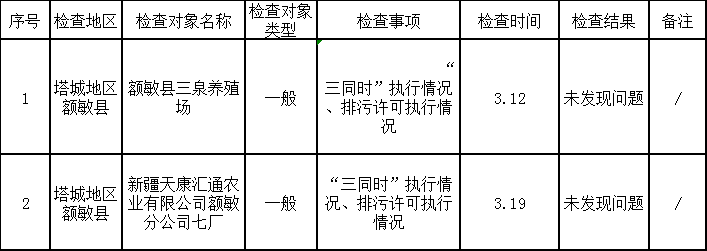 表1:2026年3月塔城地区生态环境局额敏县分局生态环境执法“双随机、一公开”抽查结果信息公开表
