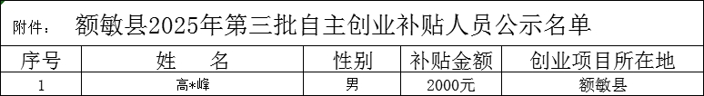 根据关于印发《新疆维吾尔自治区就业资金管理暂行办法》(新财社〔2018〕241号)》文件规定,经社区初审,符合〔2018〕241号文件第9条自主创业补贴政策:在校及离校5年以内的未就业普通高等学校、职业学校、技工院校学生,在自治区范围内领取工商营业执照(或其他法定注册登记手续),正常经营6个月以上的;对首次创办小微企业或从事个体经营,且所创办企业或个体工商户自工商登记注册之日起正常运营6个月以上的贫困劳动力;一次性给予2000元的创业资助,创业实体只能申请享受一次,不得与就业援助金重复申领。经乡镇初审人社局复审,现对符合一次性自主创业补贴人员进行公示。