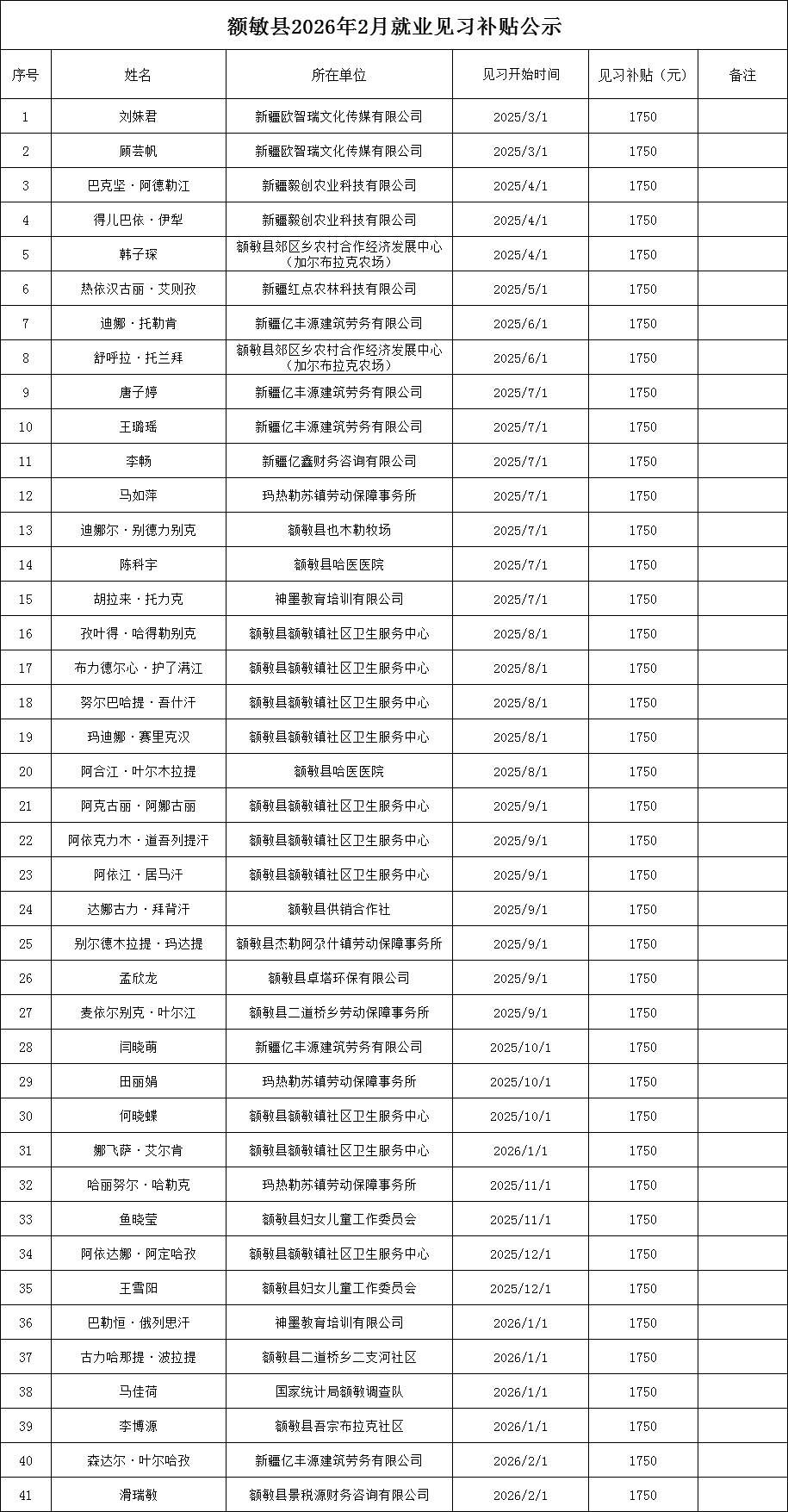 按照《关于实施就业见习岗位募集计划的通知》(新人社发〔2023〕51号)、《新疆维吾尔自治区就业资金管理暂行办法》(新财社〔2018〕241号)要求,现对额敏县2026年2月份就业见习补贴予以公示。