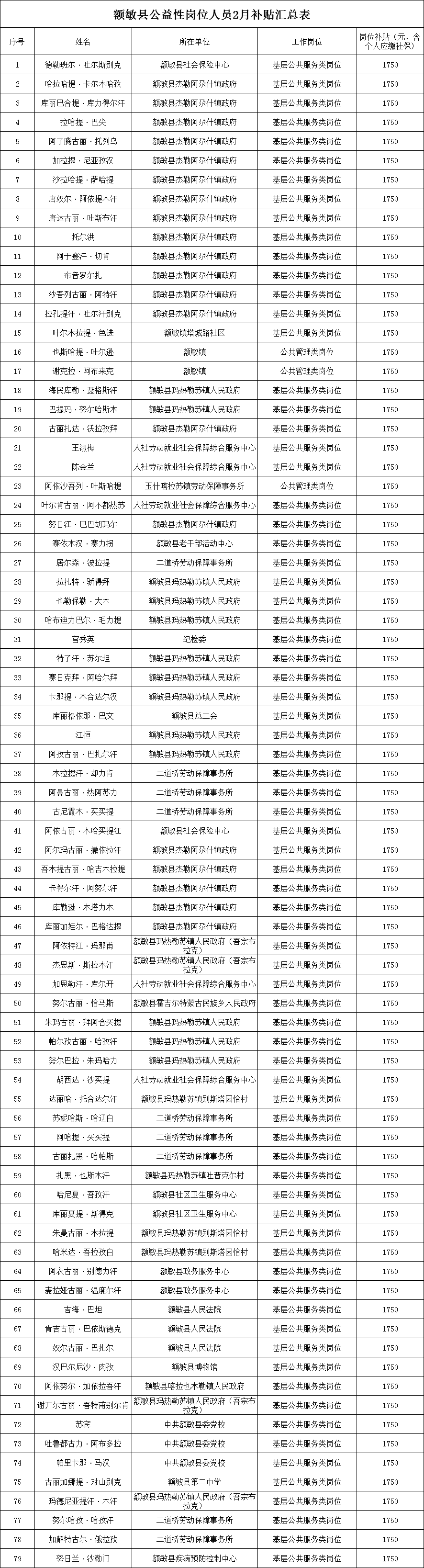 按照《新疆维吾尔自治区就业资金管理暂行办法》(新财社〔2018〕241号)、《关于进一步做好公益性岗位开发管理有关工作的通知》(新人社发〔2020〕8号)相关要求,现对额敏县2026年2月份公益性岗位人员岗位补贴予以公示。