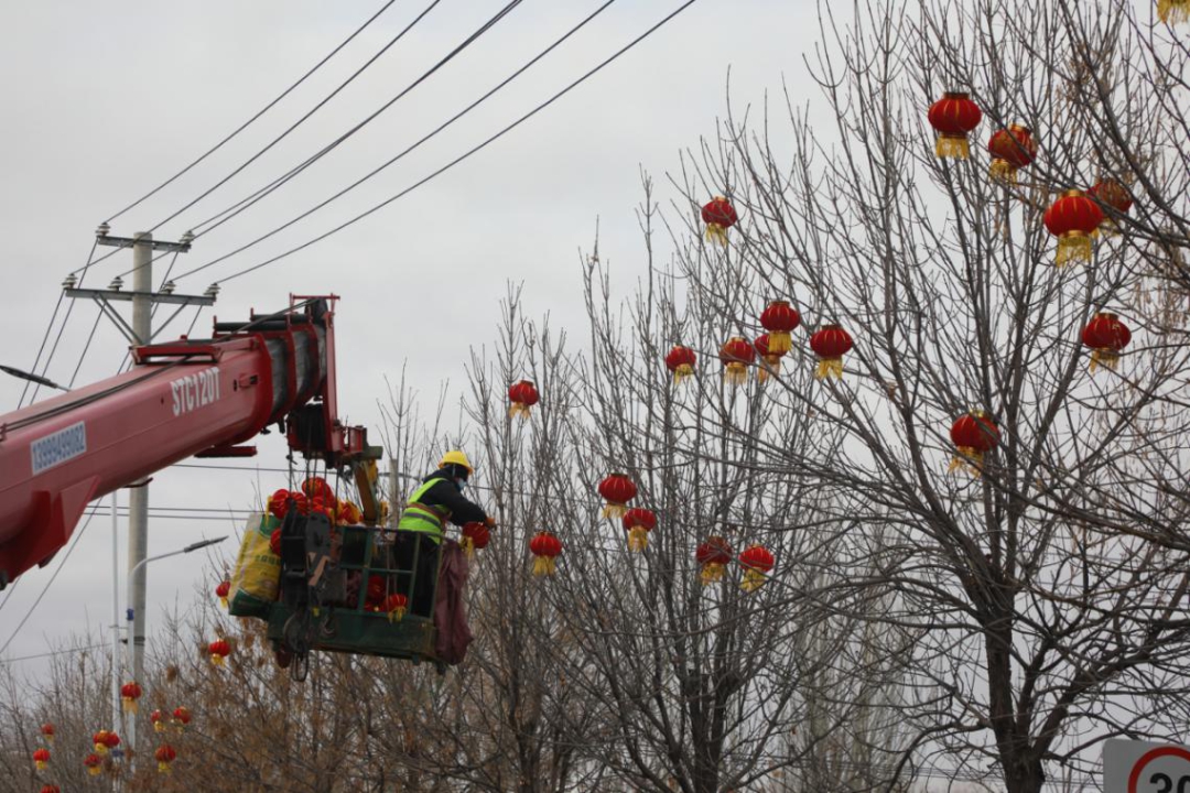 在城区主要街道、公交站台等地,额敏县住建系统工作人员进行悬挂灯笼、布置彩灯作业。红彤彤的灯笼整齐悬挂、随风摇曳,既延续了传统节日的喜庆元素,又为县城增添了生机与活力。