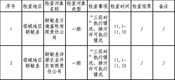 2025年11月1日至11月30日,塔城地区生态环境局额敏县分局组织开展生态环境执法“双随机、一公开”监管工作,现将具体信息公开如下: