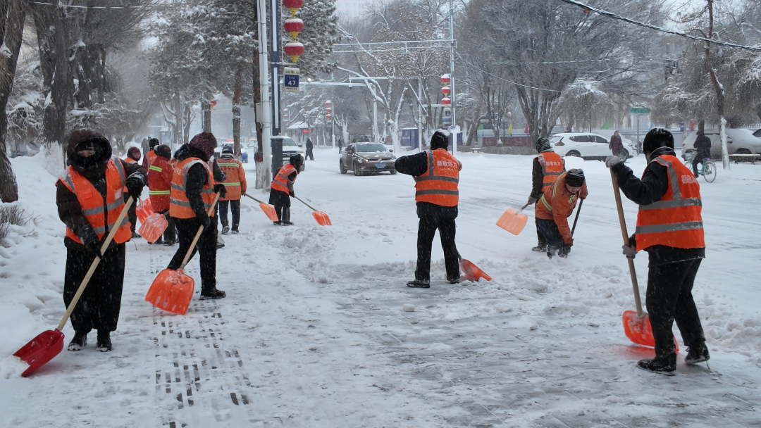 新疆绿融家乡城市运营服务有限公司以雪为令,采用“机械+人工”的作业模式清雪除冰,在城区各主次干道有序作业,保障行车安全。