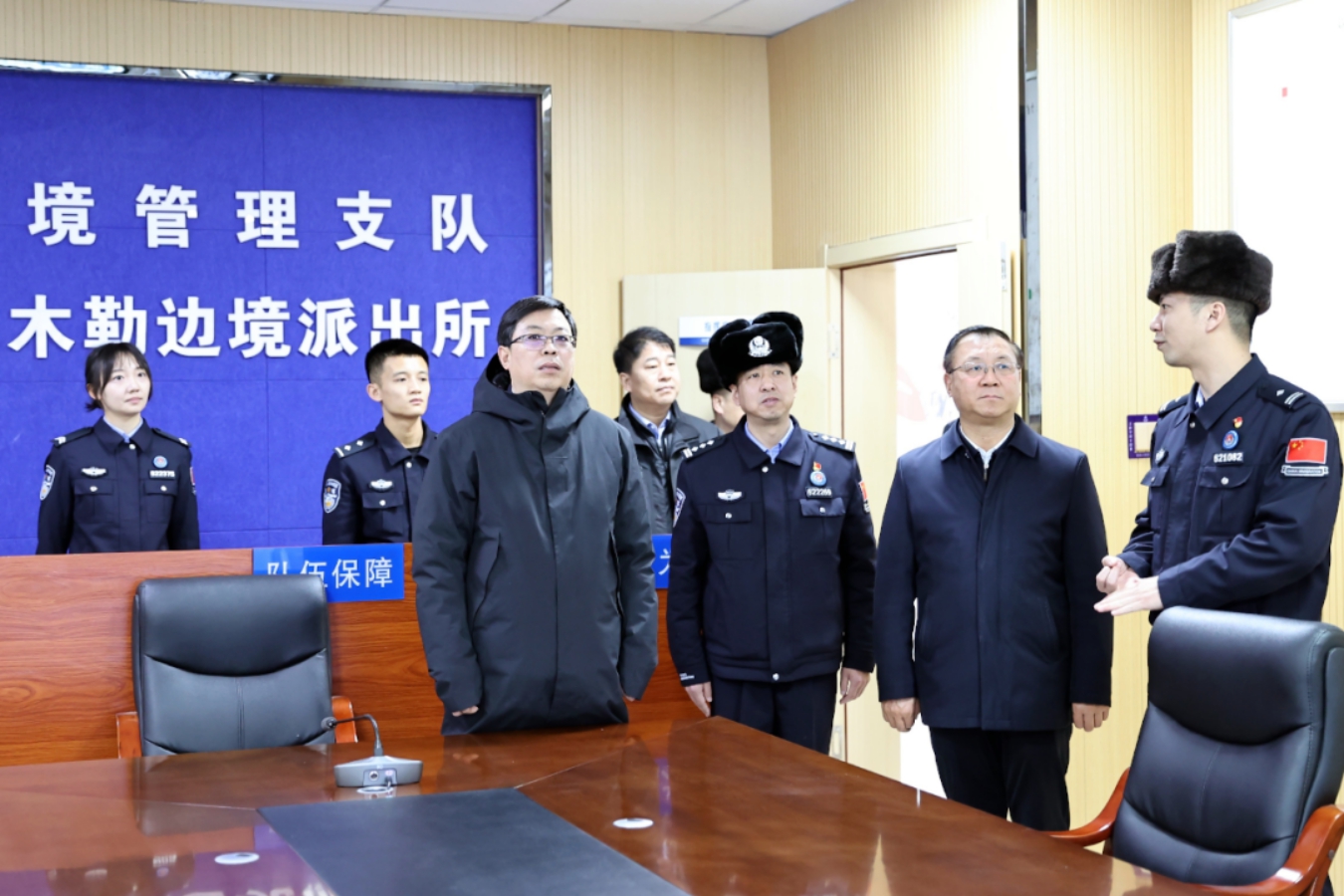 12月12日,地委书记支现伟在裕民县阿勒腾也木勒边境派出所,听取工作汇报。塔城地区融媒体中心记者苏珊琳摄